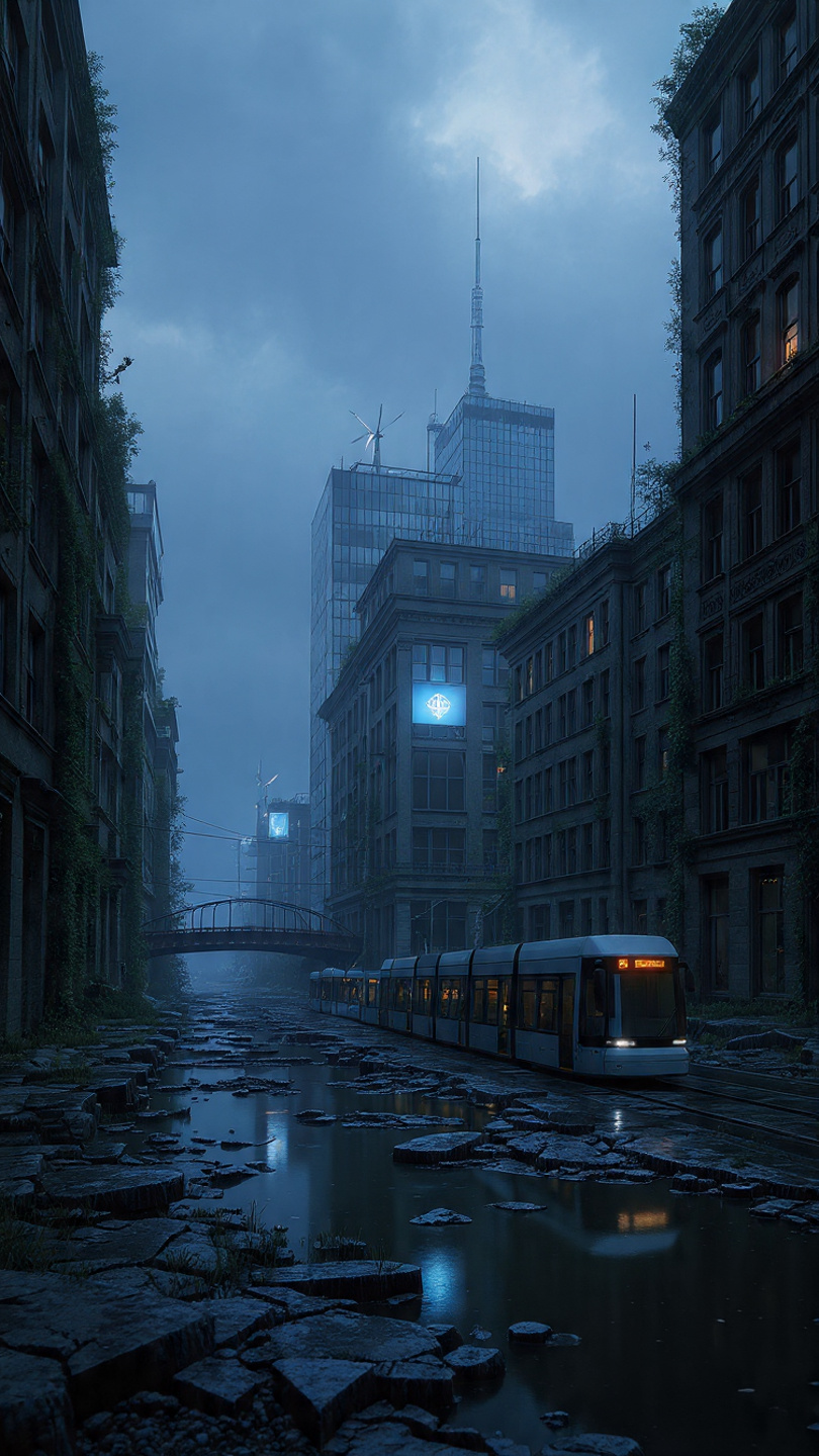 By 2058, Berlin had undergone a measured but determined reconstruction shaped by new climatic realities and post-Reset technologies. With shifting polar geography altering European weather patterns, the city now experiences colder winters, heavier storms, and more variable precipitation, resembling a milder Scandinavian climate. Reconstruction efforts focused on resilience rather than spectacle: flood-meadow parks and smart sluice-gate systems manage the Spree’s rising waters, historic façades have been retrofitted with adaptive thermal-glass panels, and modern tower blocks integrate wind-turbine spires and decentralized energy systems. Snow-dusted streets, reflective ice along cobblestones, and carefully restored districts illustrate a city that preserved its heritage while evolving into a quieter, more climate-adapted northern metropolis, symbolizing Europe’s broader recovery after the Great Reset.