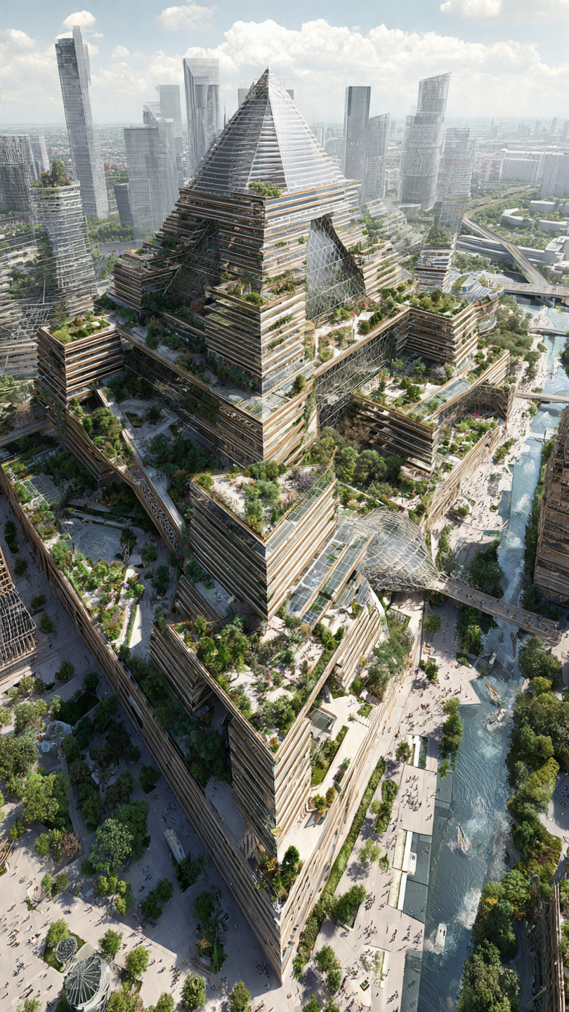 The defining feature of Bimísedong is its monumental city-block-sized pyramid, combining Indigenous architectural motifs with advanced Tesla-based energy systems. Constructed from limestone, sandstone, and reinforced timber, the pyramid's four broad faces are engraved with Anishinaabe and Wákpa symbols - sacred animals, waves, and canoe patterns - and interlaced with adaptive vertical glass panels. Multi-tiered terraces, rooftop gardens, waterfalls, and civic halls create a public, cultural, and administrative complex that integrates heritage, ecological technology, and urban functionality. The capstone emits a faint shimmering energy, distributing power throughout the city and creating a visible symbol of vitality and innovation.