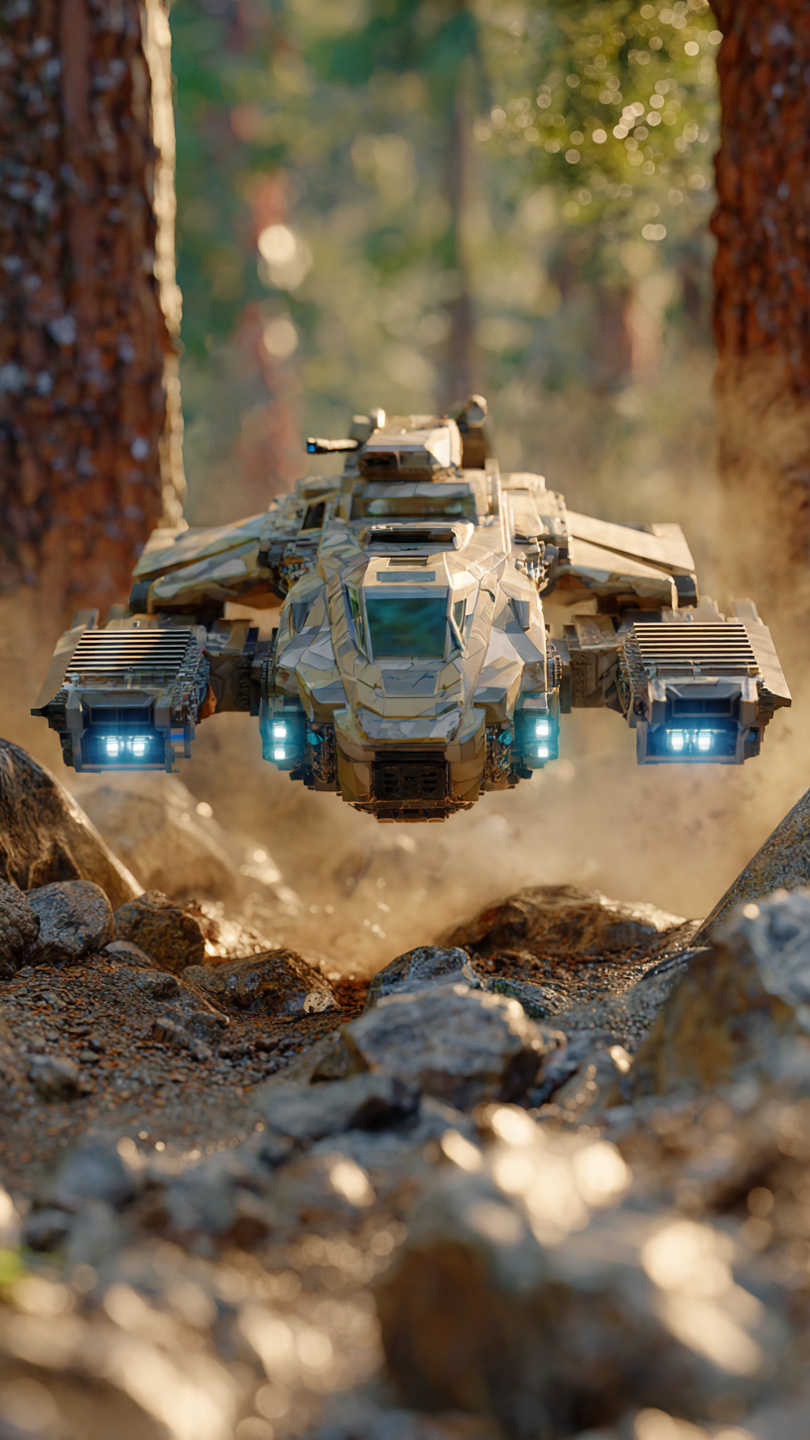 - It hovers 1–3 meters above ground using triple-band repulsor sleds that modulate lift independently, letting the tank bank, leap, and strafe like an airborne predator.