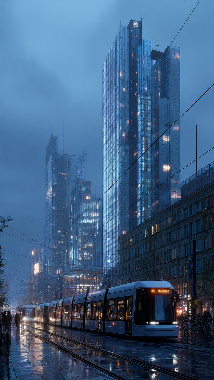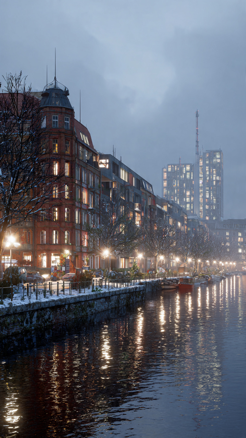 By 2058, Berlin had undergone a measured but determined reconstruction shaped by new climatic realities and post-Reset technologies. With shifting polar geography altering European weather patterns, the city now experiences colder winters, heavier storms, and more variable precipitation, resembling a milder Scandinavian climate. Reconstruction efforts focused on resilience rather than spectacle: flood-meadow parks and smart sluice-gate systems manage the Spree’s rising waters, historic façades have been retrofitted with adaptive thermal-glass panels, and modern tower blocks integrate wind-turbine spires and decentralized energy systems. Snow-dusted streets, reflective ice along cobblestones, and carefully restored districts illustrate a city that preserved its heritage while evolving into a quieter, more climate-adapted northern metropolis, symbolizing Europe’s broader recovery after the Great Reset.