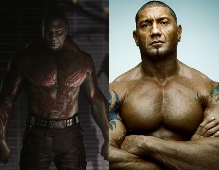 Dave Batista, a professional wrestler, plays Drax the Destroyer. And boy was he a pleasant surprise! He was crisp, clean, and articulate in his lines. He was funny and yet seemed to also be the straight man of the group. Even with all that make-up on (I heard it took several hours to get it all on) his facial expressions and mannerisms were shown clearly and made us feel as he felt. I can't say much more without revealing spoilers, but just know that his character was not just for brute strength. His character is important and probably will be again.